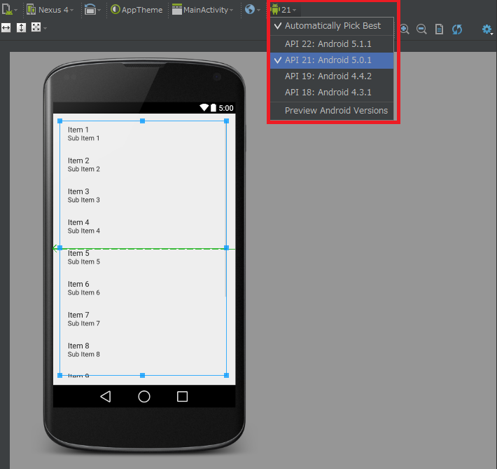 API 22を使用すると出るエラーのよう。使用するAPIを21に変更したところエラーが消えデザイン画面が表示された。